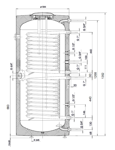 Melegvíz tároló zománcozott acélból- Beépített magnézium anódrúd- Két fűtő csőkígyó- Felső hőcserélő teljesítménye: 24 kW *- Alsó hőcserélő teljesítménye: 24 kW *- Tároló felfűtési ideje felső/alsó hőcserélővel 10 C-ról 45 C-ra: 38/19 perc- Felső hőcserélő felülete: 1,00 m2- Alsó hőcserélő felülete: 1,00 m2- Tömege víz nélkül: 108 kg- Hőveszteség: 1,4 kWh / 24 óra- Megengedett legnagyobb nyomás a tárolóban: 10 bar- Megengedett legnagyobb nyomás a hőcserélőben: 10 bar- Biztonsági szeleppel szállítva