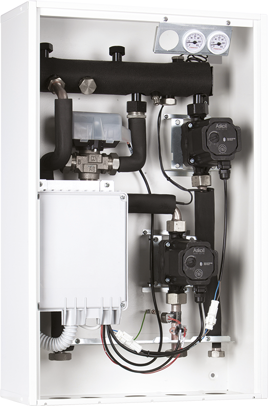 DIM ABT hidraulikai modulok zárt lemez szekrényben, falra szerelhető (vagy igény szerint falbasüllyeszthető) kivitelben. Előnyük a kis helyigény - mélységük mindössze 19 cm! - valamint az esztétikus megjelenésük és a könnyű felszerelhetőségük. Mindegyik modul tartalmazza a zónák függetlenített vezérlését (zónánkénti szobatermosztát opcióval), a megfelelő számú fűtési keringtető szivattyút és a hőszigetelt hidraulikai váltót a bekötő csövekkel és csatlakozókkal, valamint az ABT változat esetében a motoros keverőszelepet és integrált időjárásfüggő szabályozást. Ezekkel a DIM egységekkel szinte bármilyen szabályozási igény megoldható, mivel korlátlan számban összeköthetőek! A továbbfejlesztett elektronikának köszönhetően a DIM egységeket Immergas BUS csatlakozással felszerelt hőszivattyúkkal üzemeltetve az egyes zónák időjárásfüggő szabályozásának működéséhez egy érzékelő csatlakoztatása is elegendő. Az egységek alacsony energiaszíntű szivattyúval felszereltek.