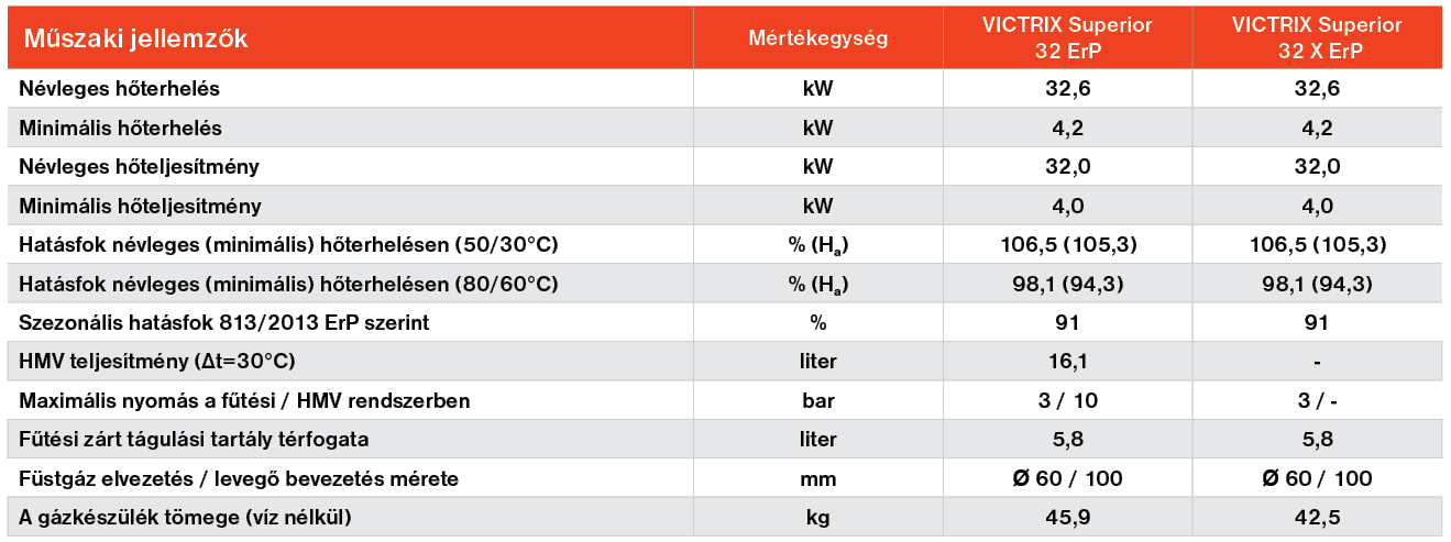 A Victrix Superior 32 X ErP fali készülék 32 kW teljesítménnyel képes fűtési, illetve igény szerint külső tárolós (indirekt) rendszerben használati melegvizet előállítani. A Victrix Superior  32 X ErP kazánok új, nagyteljesítményű hidraulikai egysége kis szervizigényű és az alacsony hidegvíz rendszernyomással is jól együttműködik. A készülék az új Super AMICO távszabályzóval (opcionális) könnyen és gyorsan, a készüléktől távolról is vezérelhető. Külső érzékelő (opcionális) csatlakoztatása esetén időjárásfüggő szabályozás (alap felszereltség) használata is lehetséges. Modulációs szivattyúja még takarékosabbá teszi a készüléket, hiszen a szivattyú fordulatszámát a vezérlő elektronika képes szabályozni. Felhasználóbarát elektronikájának köszönhetően egyszerűen üzemeltethető.